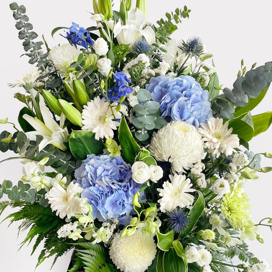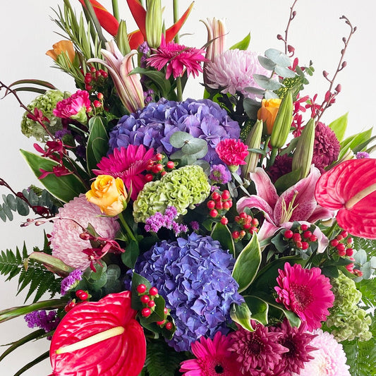 A graceful medley of hydrangeas, carnations, eustoma (lisianthus), daisies, and orchids, this bouquet radiates soft elegance and serene charm. With gentle textures and dreamy blooms, it’s perfect for celebrating love, gratitude, or simply brightening someone’s day.